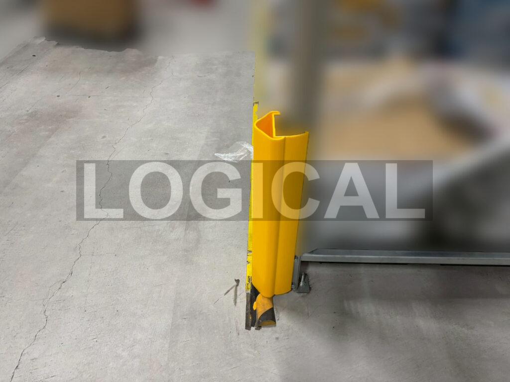 フォークリフトによるラック支柱への追突事故です。