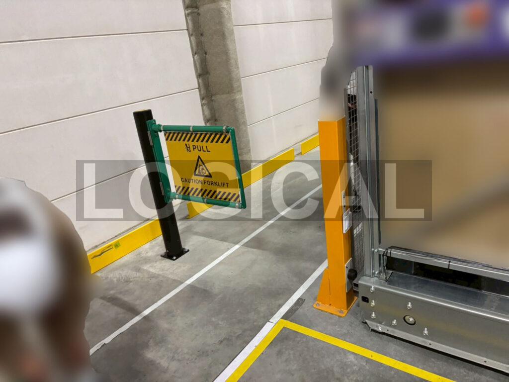 フォークリフト走行エリアに注意喚起用の走行看板を設置。